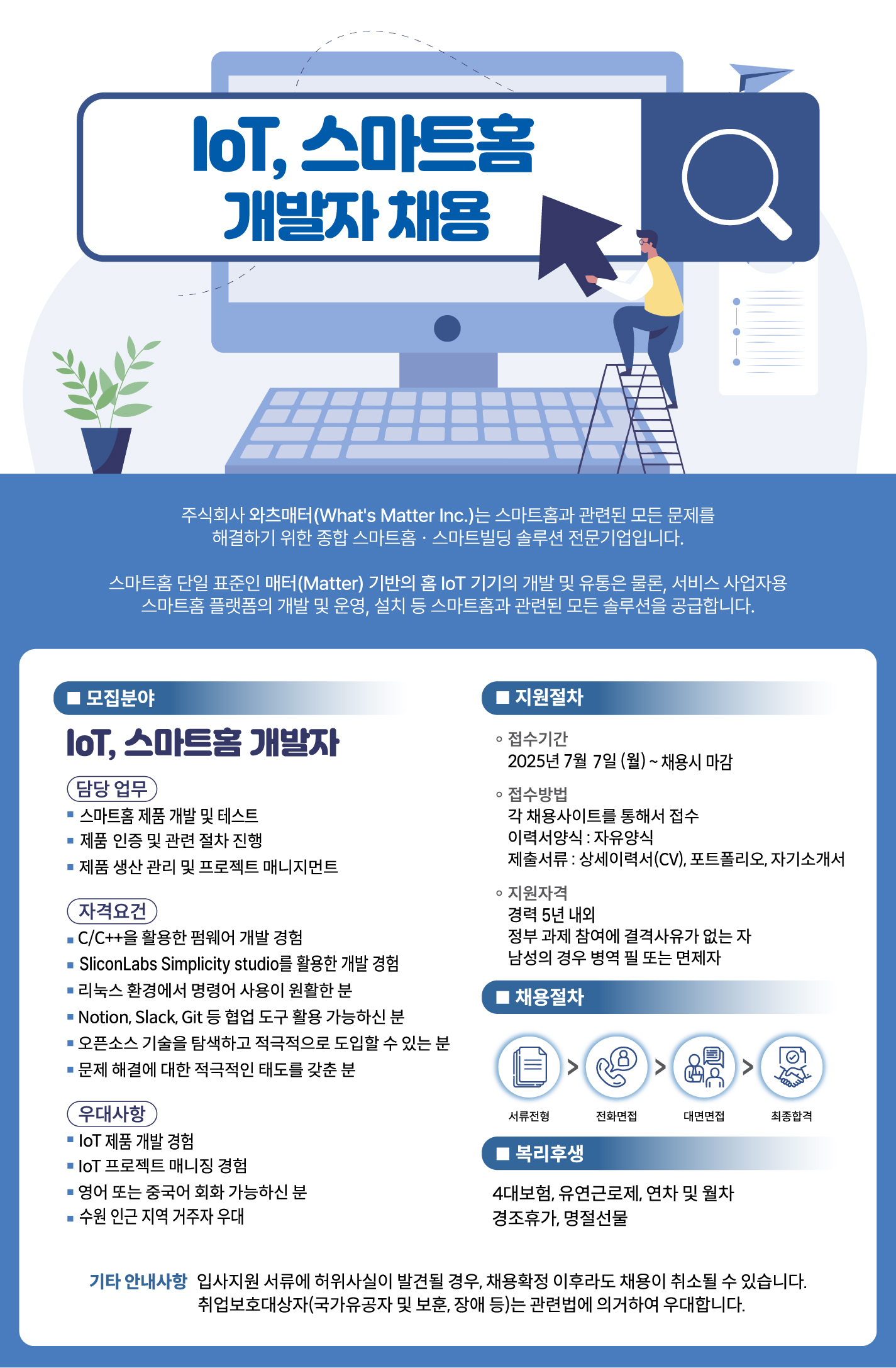 매터 표준 기반의 스마트홈 솔루션 전문 기업인 (주)와츠매터에서 경력 5년 내외의 IOT, 스마트홈 시스템 개발자를 모시고자 합니다. IOT, 스마트홈 디바이스 펌웨어 개발 및 제품 인증 관련 경험이 있으신 분들의 많은 지원 부탁드립니다. 지원은 잡코리아 및 사람인을 통해 해주시기 바랍니다. 감사합니다.
