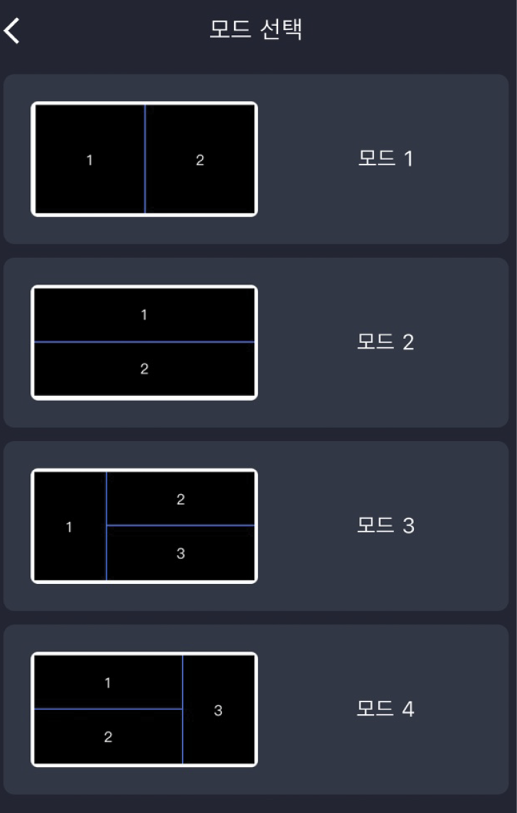 [모드 선택]에서 원하는 분할 모양을 선택하고 각 영역에 맞게 콘텐츠를 구성할 수 있습니다.