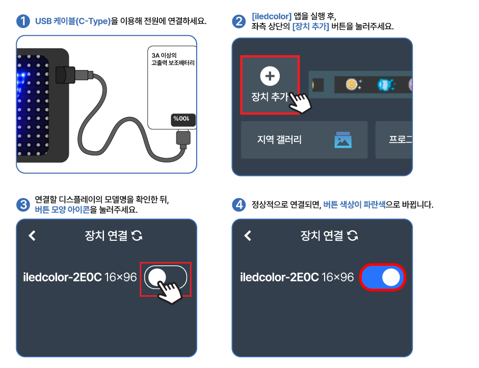 2. [iledcolor] 앱을 실행 후, 좌측 상단의 [장치 추가] 버튼을 눌러주세요.