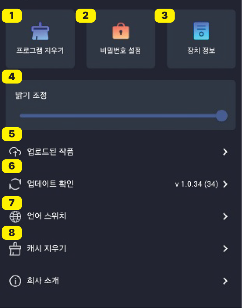 | 8 | 캐시 지우기 | 저장된 임시 데이터를 삭제할 수 있습니다. |