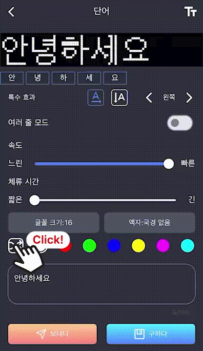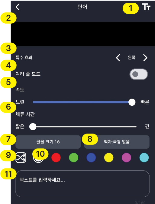 | 6 | 체류 시간 | 6글자 초과 시, 화면에 머무는 시간을 설정할 수 있습니다. |