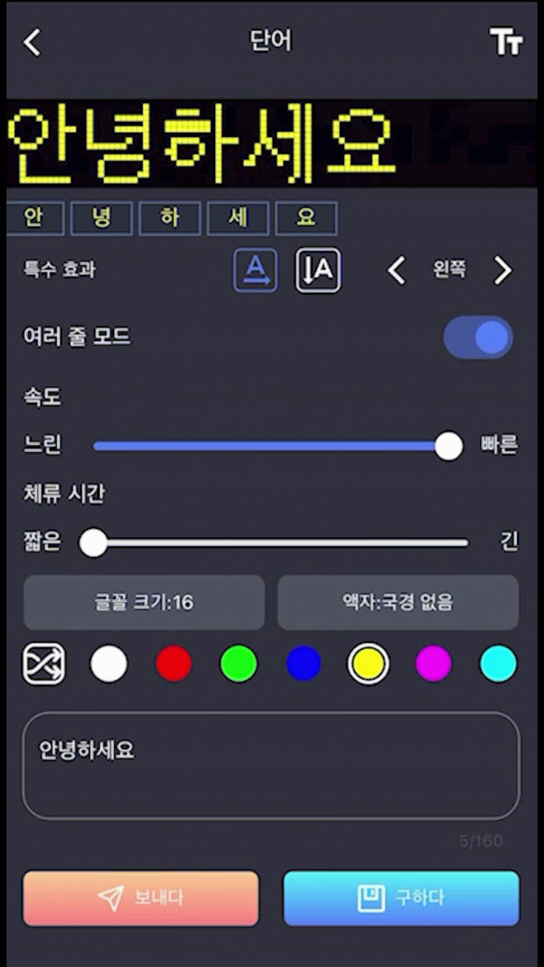 | 4 | 단어(텍스트) | 입력한 문자를 다양한 효과와 함께 디스플레이에 표시할 수 있습니다. |
