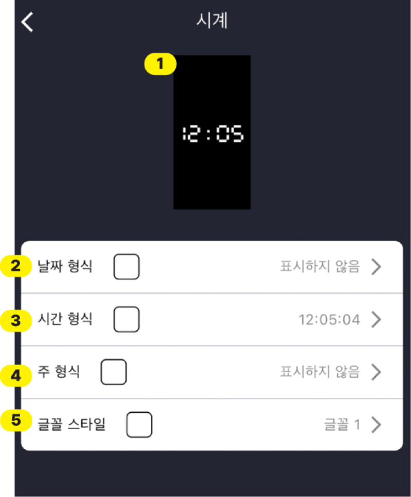 | 1 | 미리보기 | 시계 형식의 표시 화면을 미리 확인할 수 있습니다. |