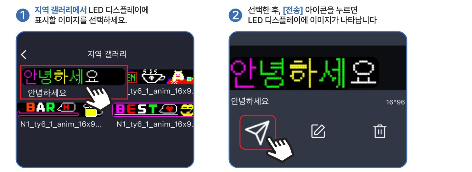 2.선택한 후, [전송] 아이콘을 누르면 LED 디스플레이에 이미지가 나타납니다.