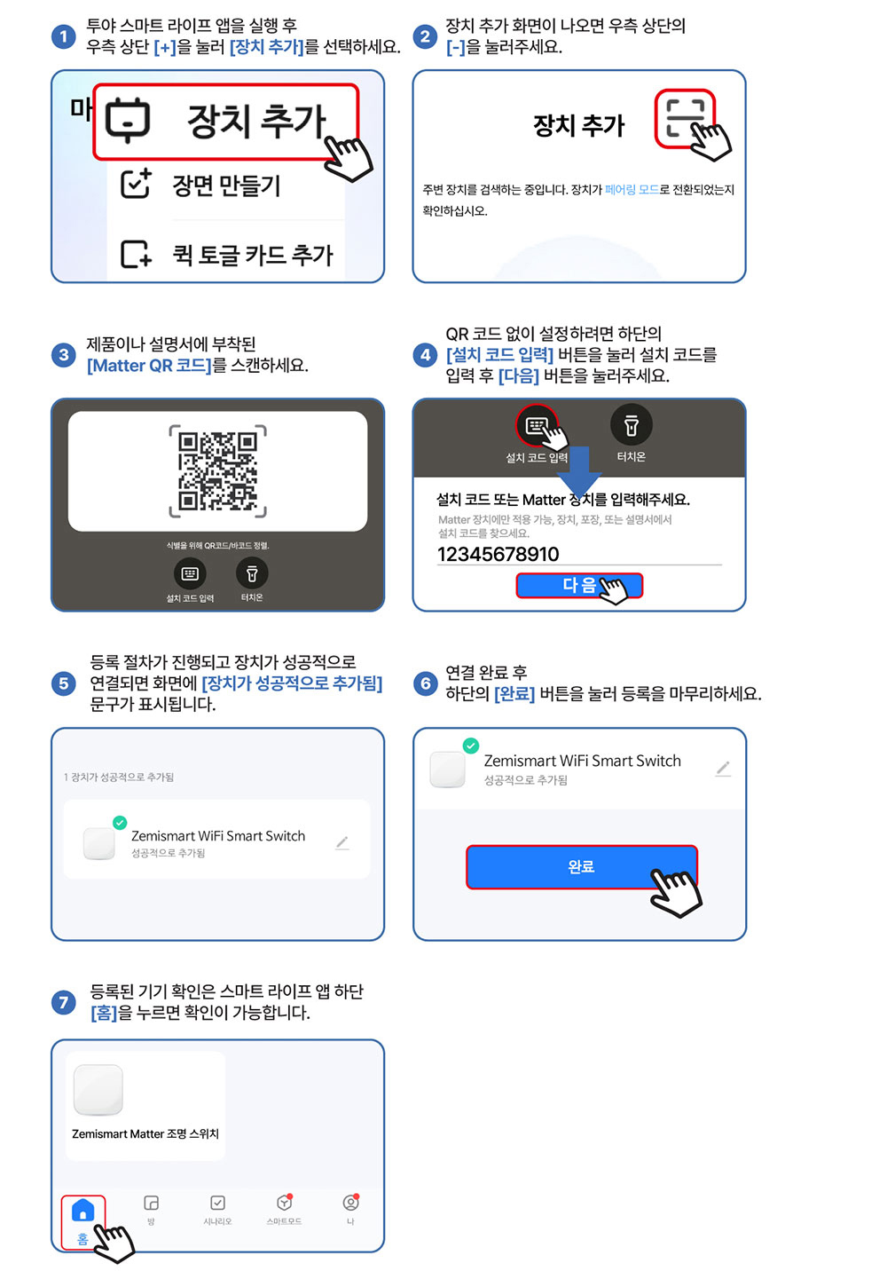 7. QR 코드를 스캔하거나 설정 코드를 입력해 기기 추가를 했다면 앱 화면 안내에 따라 순서대로 등록을 진행하세요.