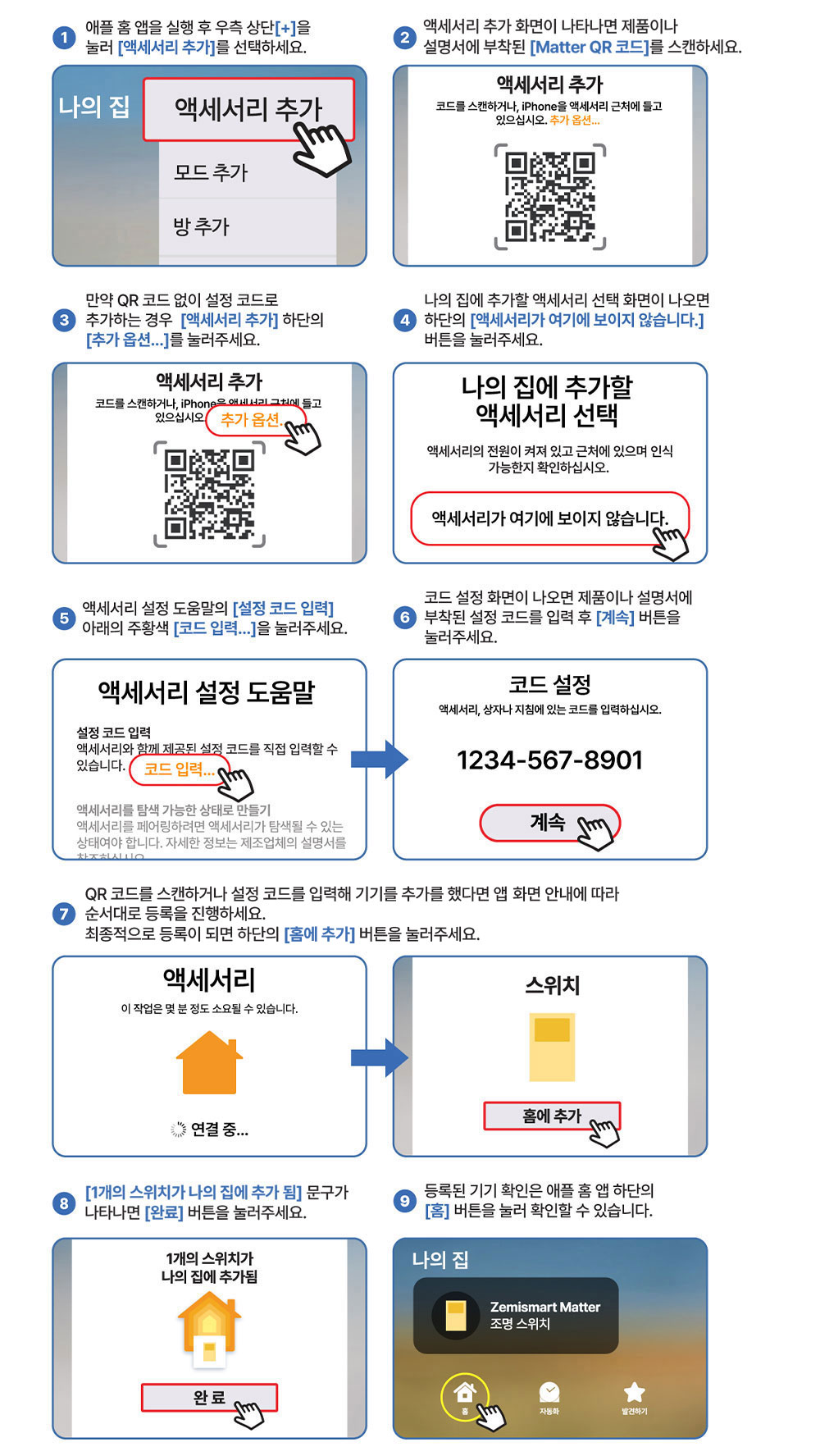 | 사용하는 앱의 기기 연결이 실패한 경우 | - 스위치 버튼을 12초 이상 길게 눌러 페어링 모드 진입 여부를 확인하세요. - Wi-Fi 연결 상태(2.4GHz 여부 등)를 확인하세요. - 앱에서 Matter 허브가 오프라인 상태인지 정상 연결 되어있는지 확인하세요. - 3분 이상 아무 동작이 없을 경우 페어링 모드가 자동으로 해제됩니다. 재설정을 위해 스위치의 아무 버튼을 12초간 길게 눌러 주세요. |