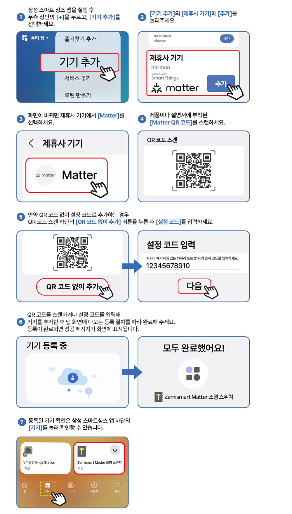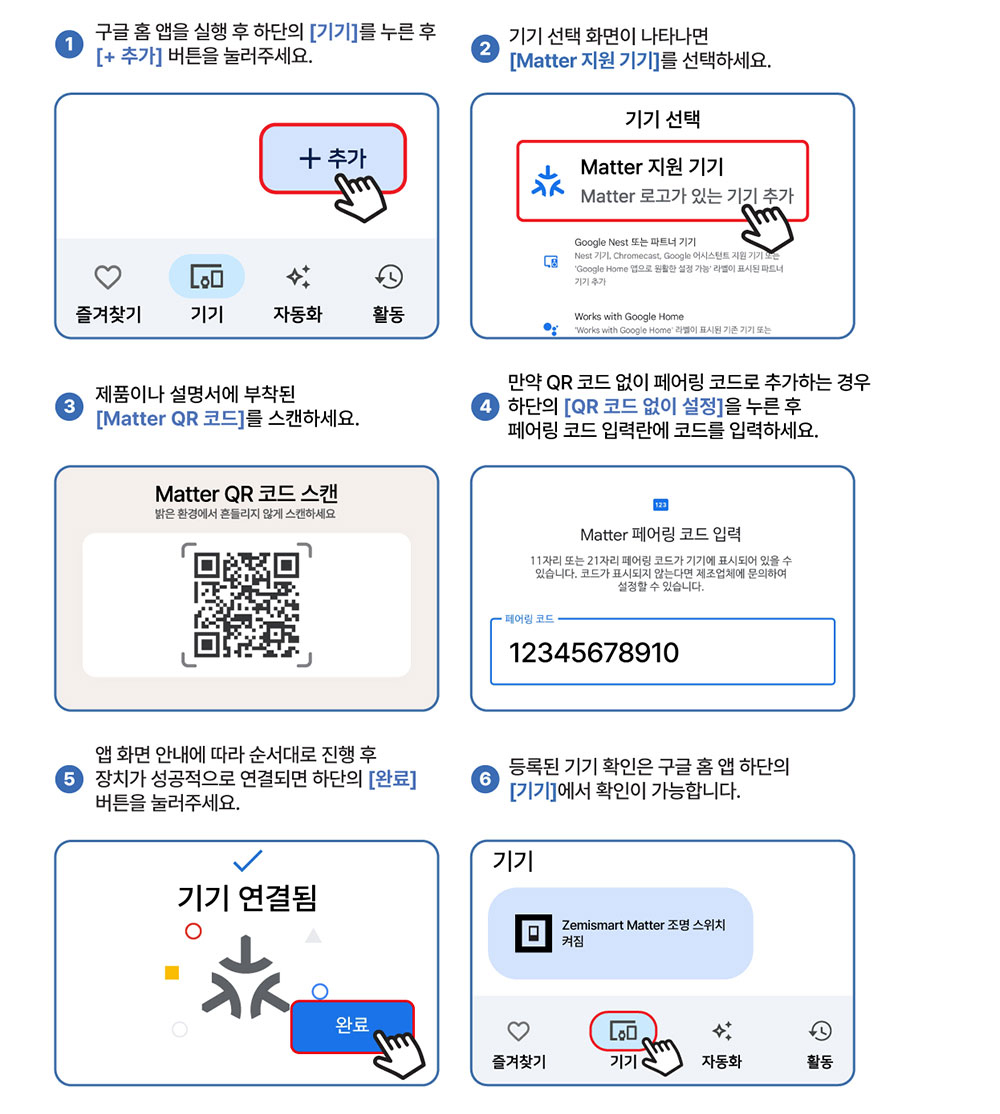 주의 : 기기를 연동하려면 해당 플랫폼에서 지원하는 Matter 허브가 필요합니다.