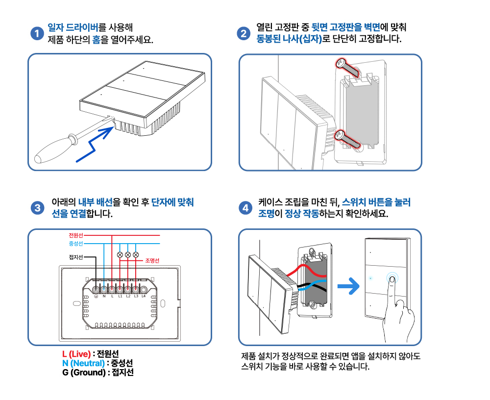 제품 설치가 정상적으로 완료되면, 앱을 설치하지 않아도 스위치 기능을 바로 사용할 수 있습니다.