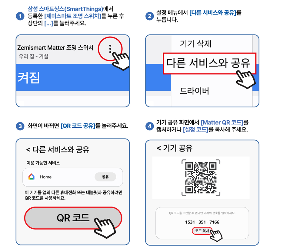 4. 기기 공유 화면에서 [Matter QR 코드]를 캡처하거나 [설정 코드]를 복사해 주세요.